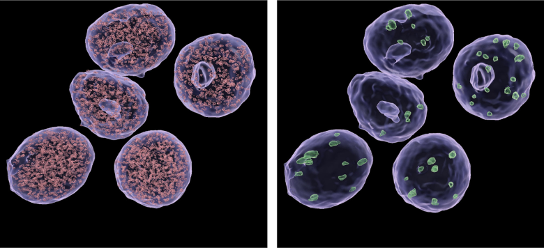 Small (left) and large (right) Med14 condensates inside the nucleus of pancreatic beta cells. (Image courtesy of the Salk Institute)